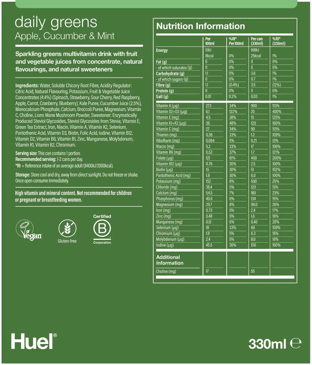 Experience the convenience of Huel Daily Greens RTD, a lightly sparkling supergreens beverage delivering 41 essential vitamins, minerals, superfoods, adaptogens, electrolytes, and 3g of fiber per serving. Crafted to provide a cold, crisp taste that transforms your daily greens intake into a refreshing treat, this ready-to-drink formula requires no preparation—no scoops, shakers, or powders. Ideal for those seeking a scientifically balanced, nutrient-rich boost to support overall wellness with ease and efficiency.